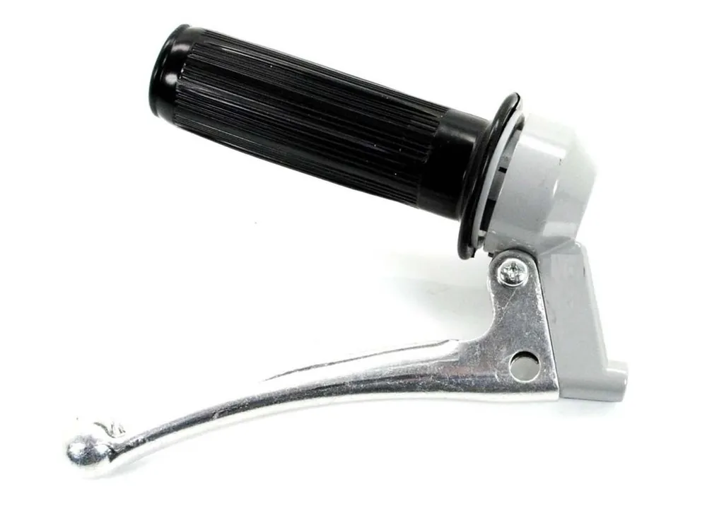 Plynová armatura s černým gumovým gripem a hliníkovou spojkovou páčkou, vhodná pro Zündapp, Kreidler, Hercules, Puch a DKW. S otvorem pro zrcátko.