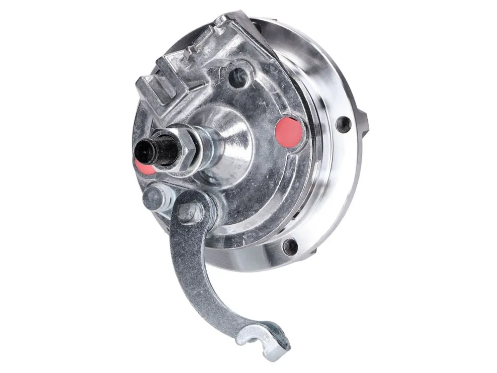 Kompletní sestava náboje kola s brzdovým štítem, vhodná pro přední lité kolo Grimeca pro Puch Maxi, určena pro tuto kombinaci.