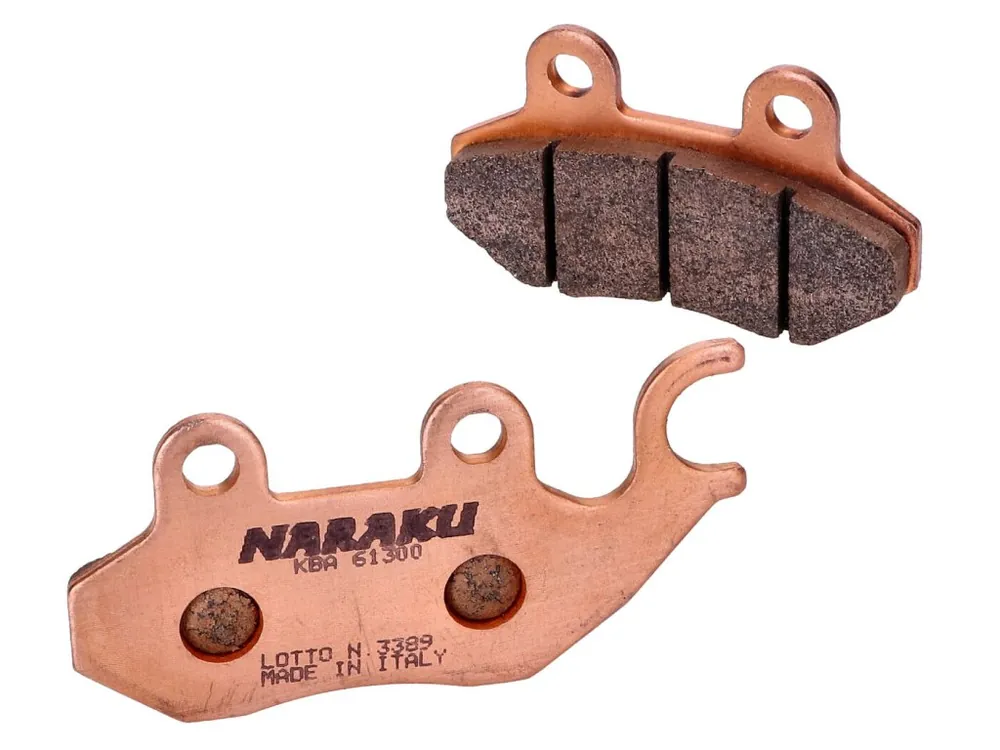 Naraku sintrové brzdové destičky s homologací pro skútry a motorky. Hlavními charakteristikami této vysoce kvalitní brzdové směsi jsou vynikající brzdné hodnoty, přesná dávkovatelnost, velmi dobré brzdné vlastnosti za mokra, nízké opotřebení a minimální vadnutí při vysokých brzdných teplotách.