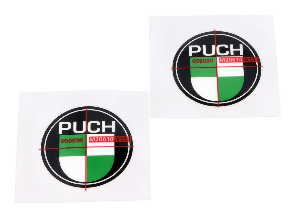 Dvě kulaté samolepky s logem Puch určené na nádrž, umístěné na nosné fólii, tříbarevné provedení. Motiv je ve třech barvách.