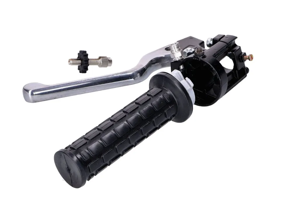 Sestava plynové rukojeti s držákem spínače, páčkou a černou gumovou rukojetí. Včetně šroubu pro seřízení lanka. Pro více modelů, špičková replika.