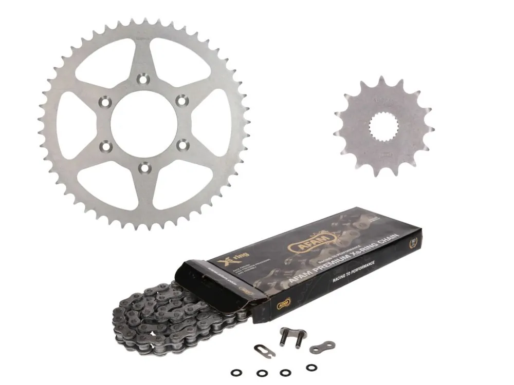 Vysoce kvalitní řetězová sada od francouzského specialisty na hnací soustavu AFAM. Tato řetězová sada odpovídá továrnímu převodu. Ve srovnání s originálními hnacími řetězy jsou řetězy AFAM obvykle silnější. Tato řetězová sada AFAM zahrnuje přední pastorek s 15 zuby, rozetu s 49 zuby, hnací řetěz 520 s technologií XS-Ring, který má 114 článků a spojku řetězu. Délka řetězu obvykle není třeba upravovat a řetěz má pevnost v tahu 3300 kg. Tato řetězová sada je vhodná pro stroje Aprilia RX 125 2T od roku 2008 až do roku 2010.
