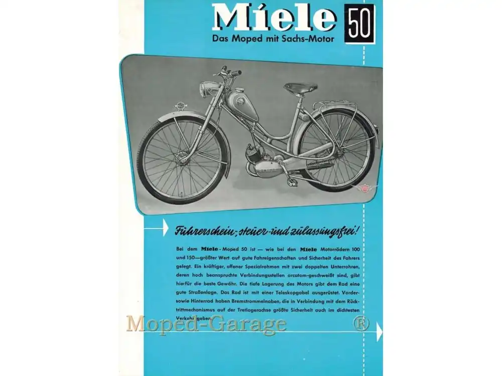 Originální reklamní leták Miele pro moped K 50 ve formátu A4 v dobrém stavu bez děr s mírným znečištěním vhodný pro Miele K 50