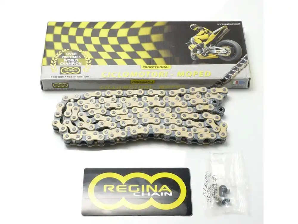 Regina černozlatý řetěz pro Zündapp, Kreidler, Puch, KTM, DKW a Hercules Mofa a Moped. Lze jej zkrátit při montáži. Včetně spojky. Vyrobeno v Itálii.
