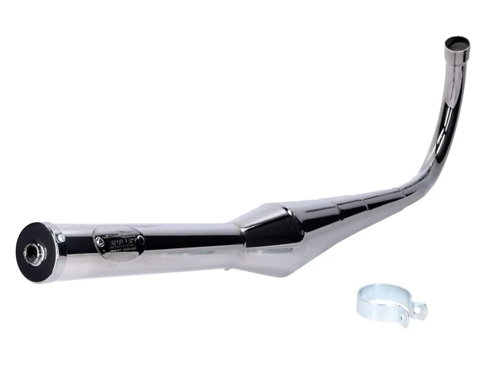 Pochromovaný výfuk EVO 1 od Bullet vhodný pro Zündapp mopedy a mofy Mopeds und Mofas. Součástí balení je také objímka výfuku.