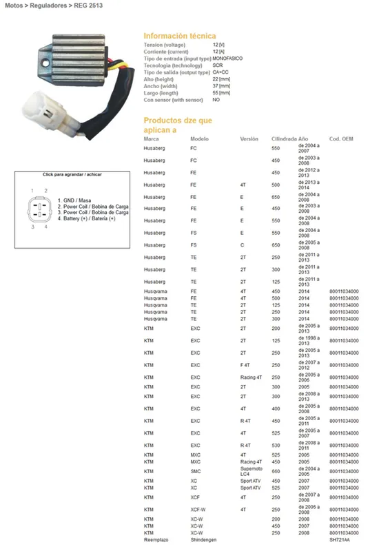 Kompletní specifikace KompatibilitaDíl DZE regulátor napětí KTM EXC 125/200/250/300/400/525/530 98-13; XC-W 250/450/525 07-08; HUSQVARNA TE/TX/FE/FC/FS 125/250/300/450/500/550/650 04-19; BETA 250/400/450/498 05-12 (80011034000) (12V/12A) (801103400) (SH721AA) je vhodný pro: